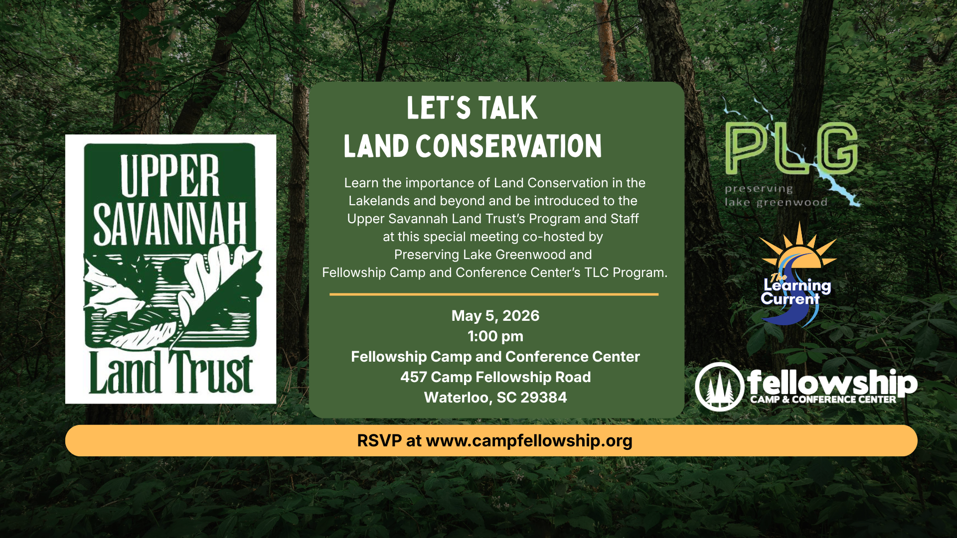 Learn the importance of Land Conservation in the Lakelands and beyond and be introduced to the Upper Savannah Land Trust’s Program and Staff at this special meeting co-hosted by Preserving Lake Greenwood and Fellowship Camp and Conference Center’s TLC Program. May 5, 2026 1:00 pm Fellowship Camp and Conference Center 457 Camp Fellowship Road Waterloo, SC 29384