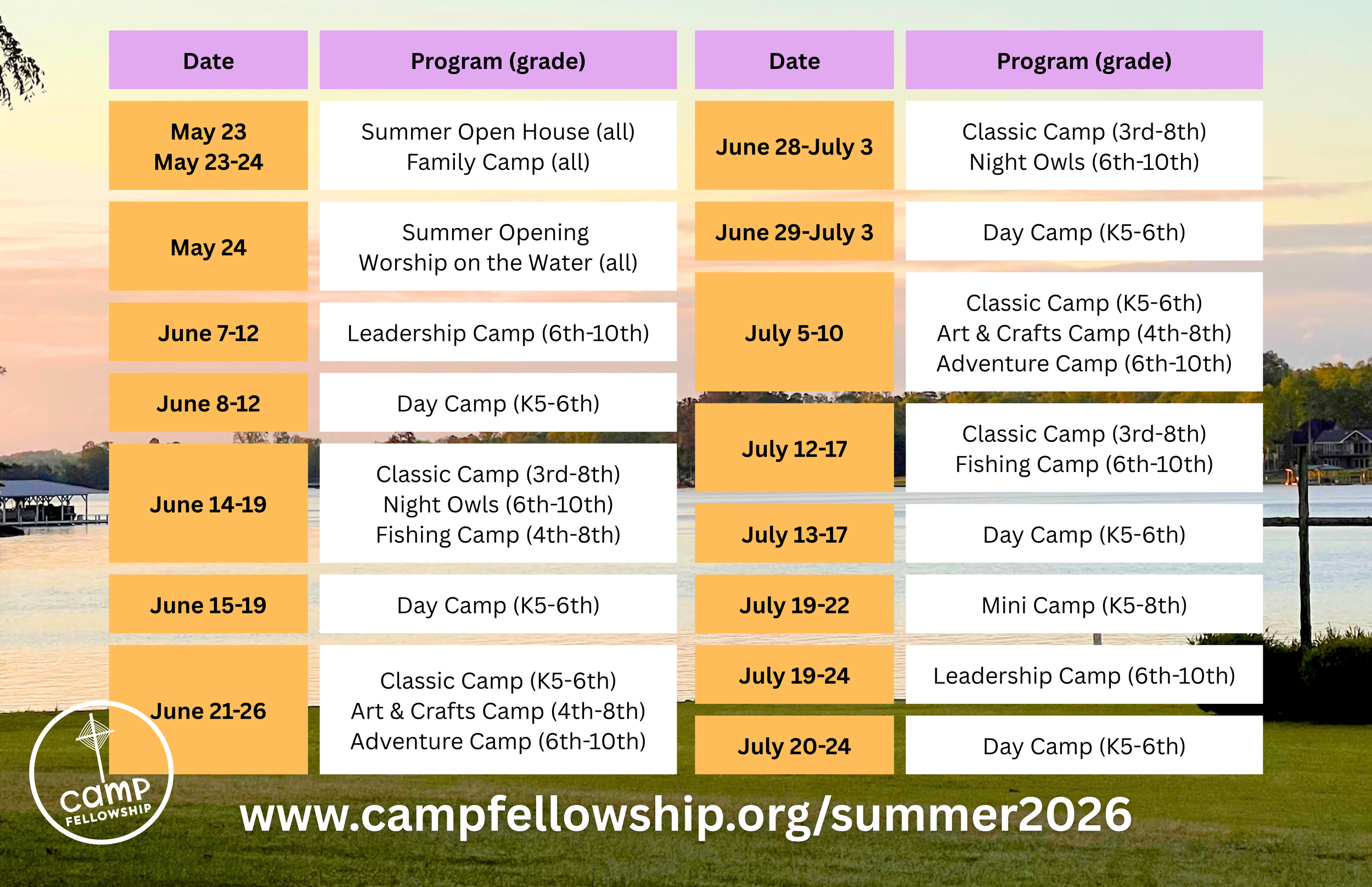 Summer Camp 2026! Sunday, June 7, 2026 2:30 PM 14:30 Friday, July 24, 2026 3:30 PM 15:30 Fellowship Camp & Conference 457 Camp Fellowship Road Waterloo, SC, 29384 United States (map) Google Calendar ICS Register HERE!