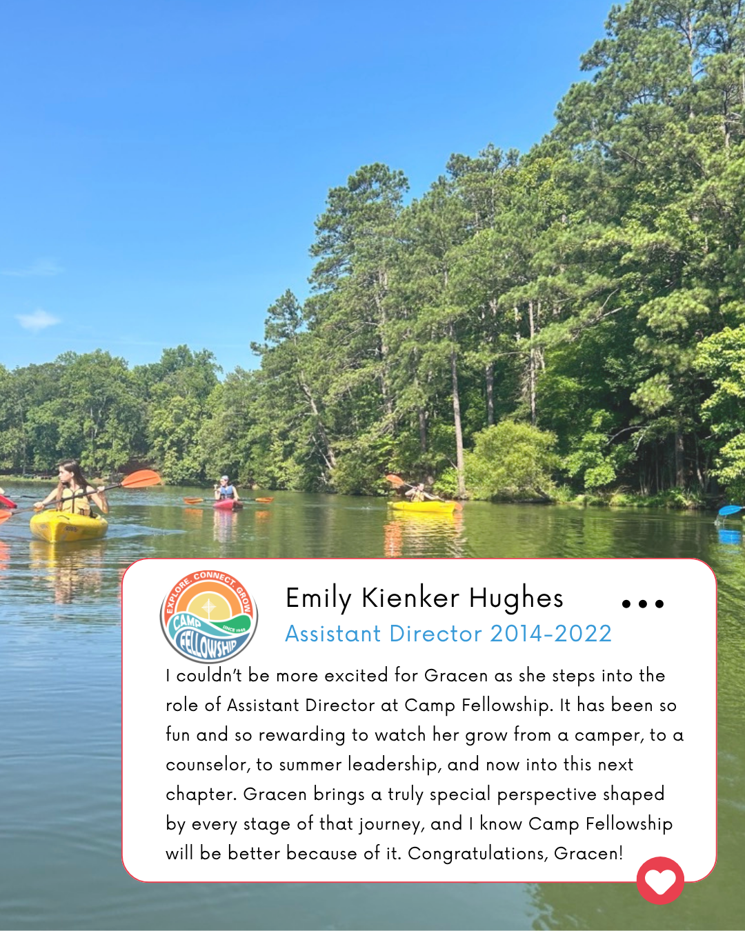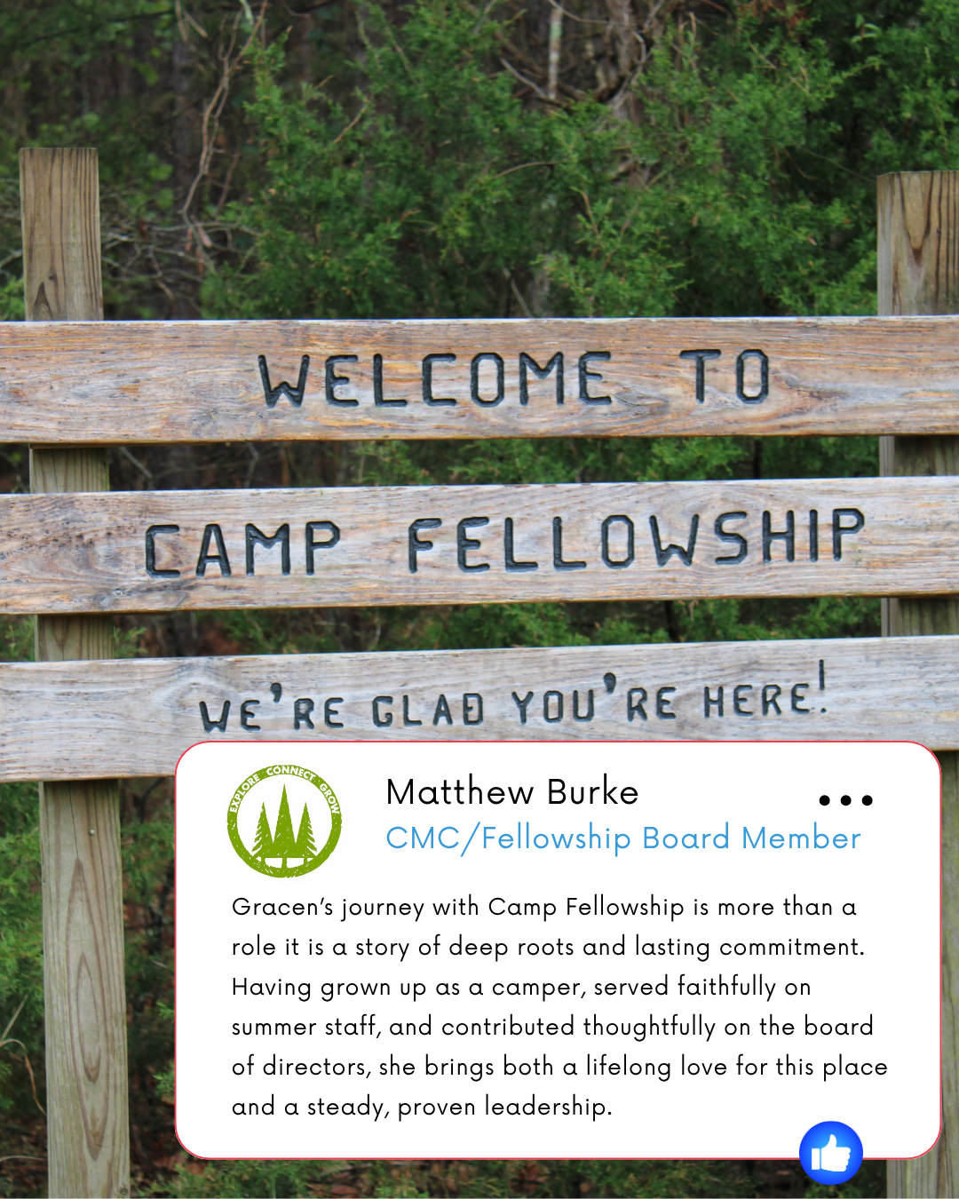 “Gracen’s story is, in many ways, the story we hope every camper can one day tell,” said Kevin Cartee, Executive Director of Fellowship Camp and Conference Center. “She has been shaped by this place, has invested in its future as a board member, and now steps into a leadership role at a pivotal time for our ministry. Her passion, perspective, and commitment to our mission will serve our community well.”